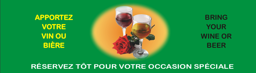 15% DE RABAIS Pour chaque commande de 15$ et plus avant taxes L'escompte de 15%, sera ajustée à la fin de votre commande en inscrivant le code 15 dans la case escompte et cliquer sur ACTIVER | 15% DE RABAIS AINSI qu'un riz au poulet OU 4 egg rolls au Porc pour chaque 25$ et plus avant taxes | Pour une livraison de 25$ et plus avant taxes obtenez GRATUITEMENT un riz au poulet OU 4 egg rolls au Porc |